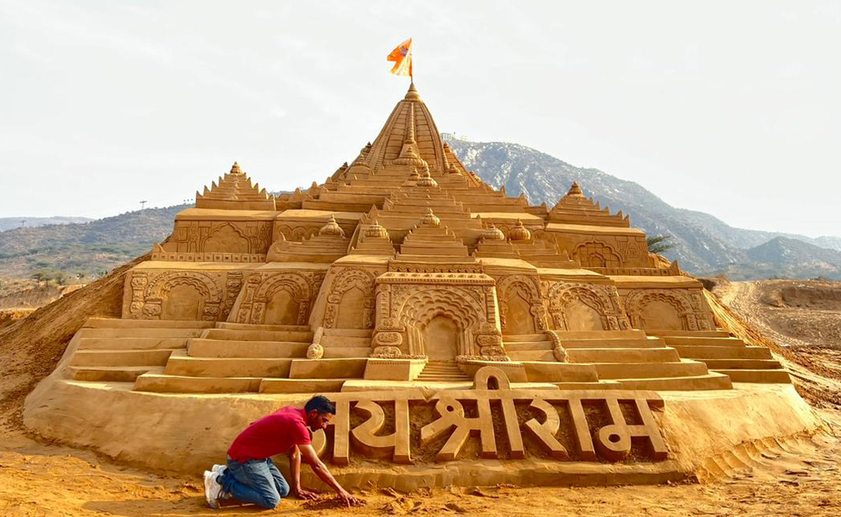 पुष्कर के सैंड आर्टिस्ट अजय रावत (Ajay Rawat) ने सबसे बड़े राम मंदिर की ये कलाकृति बनाई है. अजय रावत ने बताया, 'करीब एक महीने पहले मैंने कलाकृति बनाने की शुरुआत की थी जो आज पूरी हो चुकी है.' पुष्कर स्थित रेत के थोरो में बालू मिट्टी का राम मंदिर तैयार किया गया है. इस कलाकृति की 20 जनवरी को वैदिक मंत्रोच्चर के साथ पूजा अर्चना कर शुरुआत की गई.
