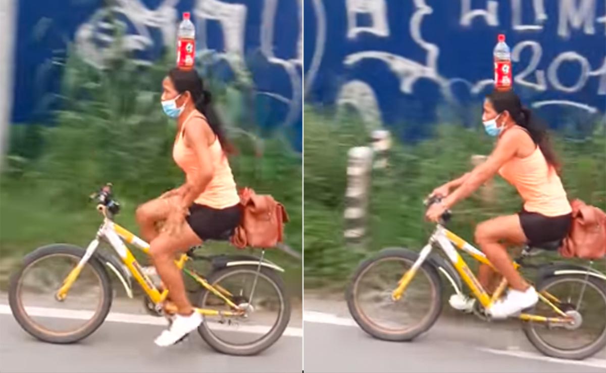 सिर पर बोतल रखकर तेज़ रफ्तार में साइकिल चला रही थी महिला