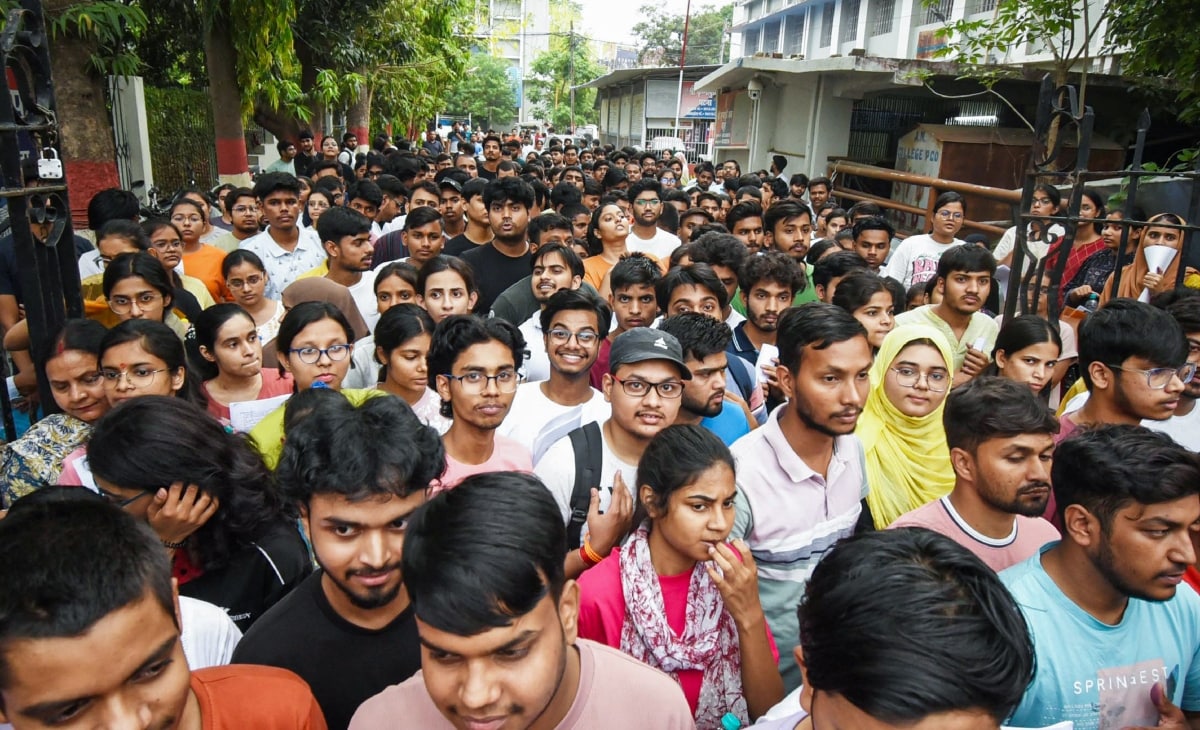 प्रयागराज में 2025 में एक परीक्षा केंद्र पर जेईई परीक्षार्थी