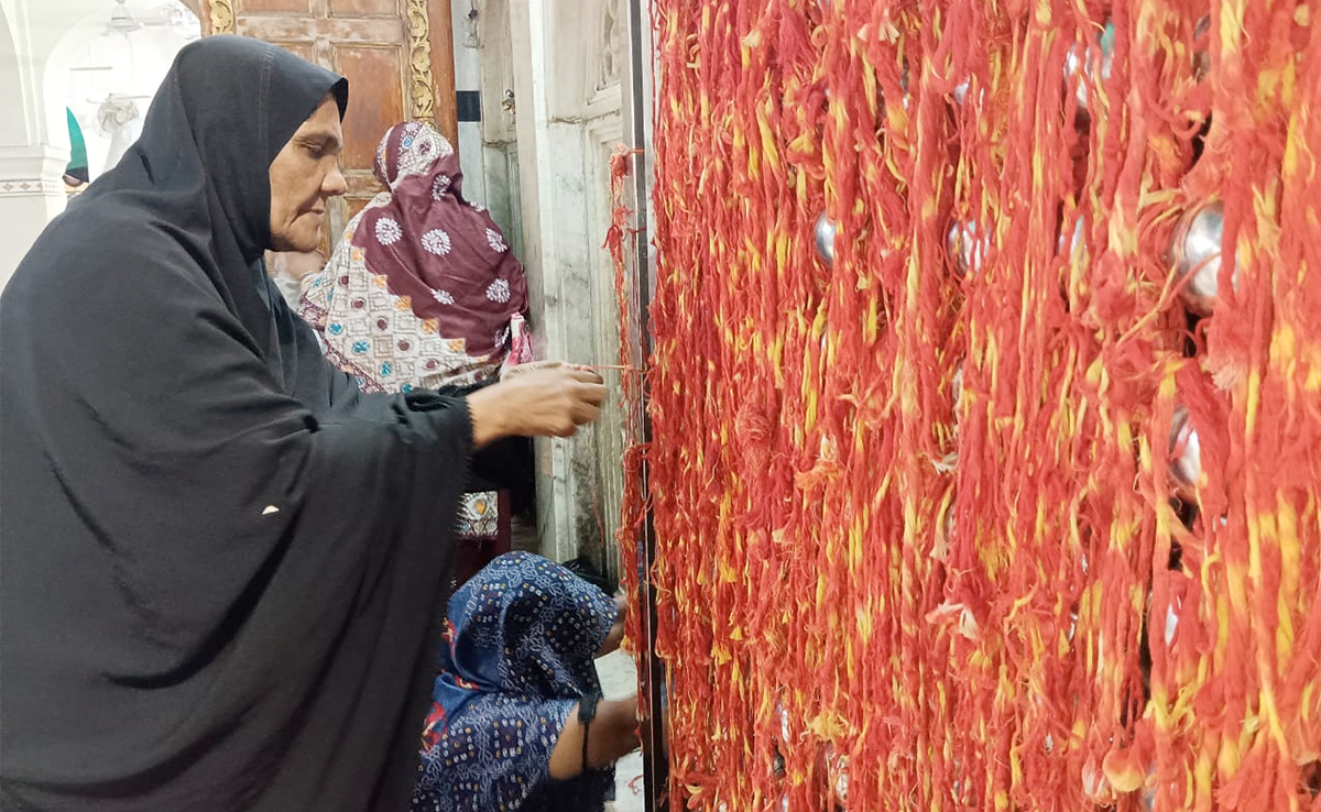 ख्वाजा मोईनुद्दीन चिश्ती की दरगाह में धागा बांधती महिला