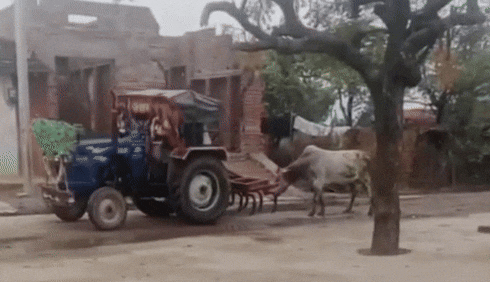 भीलवाड़ा में सांड को टैक्ट्रर से घसीटने का वीडियो वायरल होने के बाद गांव में हंगामा हो गया. बात इस हद तक बढ़ गई कि युवक को सार्वजनिक तौर पर गौवंश पर अत्याचार दी गई. मामला शाहपुरा के कादिसहाना गांव का है, जब खेत को नुकसान होने के बाद गुस्साए युवक ने सांड को ट्रैक्टर के पीछे बांध दिया. इसके बाद वह उसे घसीटते हुए गांव के बाहर छोड़ आया. यह पूरा घटनाक्रम कैमरे में कैद हो गया. जब वीडियो सामने आया तो ग्रामीणों में आक्रोश देखा गया. 'तुगलकी सजा' देते हुए युवक को चौराहे पर खड़ा करके कान पकड़कर माफी मंगवाई. उसे मुर्गा तक बनाया गया और युवक को कान पड़कर गांव में घुमाया.