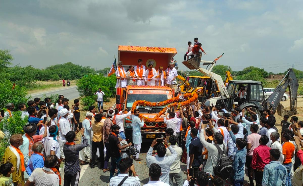 भारतीय जनता पार्टी की परिवर्तन संकल्प यात्रा मंगलवार को टोंक जिले में पहुंची, जहां कार्यकर्ताओं ने परिवर्तन संकल्प यात्रा के रथ पर सवार होकर पहुंचे भाजपा के प्रदेश प्रभारी अरुण सिंह का बुलडोजर पर चढ़कर फूल बरसाकर स्वागत किया. यात्रा निवाई, टोंक, उनियारा-देवली और मालपुरा-टोडारायसिंह क्षेत्र में रहेगी. यात्रा के दौरान जगह- जगह कार्यकर्ता बुलडोजर से पुष्पवर्षा करतें दिखे.