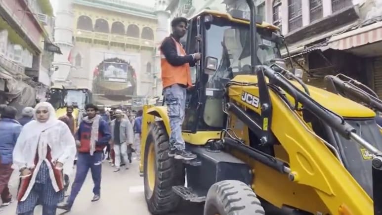 दरगाह के बाहर चलता हुआ बुलडोजर.