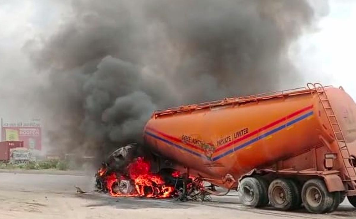 जयपुर रोड हाइवे पर भीषण सड़क हादसा हो गया. किशनगढ़ के जयपुर राष्ट्रीय राजमार्ग बांदर सिंदरी थाना क्षेत्र के पाटन चौराहे के पास एक सीमेंट से भरे टैंकर ने बाइक सवार को अपने चपेट में ले लिया. प्रत्यक्षदर्शियों के मुताबिक तेज रफ्तार से आ रहे सीमेंट भरा टैंकर बाइक सवार को टक्कर मारते हुए बेकाबू हो गया और ट्रेलर और जीप से जा भिड़ा. हादसे के बाद टैंकर में भीषण आग लग गई जिसमें टैंकर का इंजन जलकर खाक हो गया.