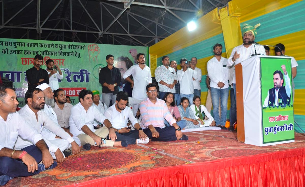 राष्ट्रीय लोकतांत्रिक पार्टी (आरएलपी) के सुप्रीमो और नागौर सांसद हनुमान बेनीवाल ने शनिवार को सीकर शहर के कृषि उपज मंडी में छात्रसंघ चुनाव को बहाल कराने और बेरोजगार युवाओं के हक के लिए आयोजित छात्र अधिकार रैली को संबोधित किया.