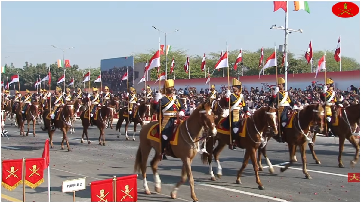 'अब आपके सामने से गुजर रहा है सेना का वह दस्ता, जो रेगिस्तान की तपती रेत और दुर्गम रास्तों का बेताज बादशाह है.' सीमा सुरक्षा बल (BSF) और सेना का ऊंट दस्ता अपनी अलंकृत वेशभूषा में मंच के सामने से गुजर रहा है.