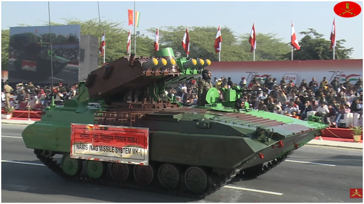 मैकेनाइज्ड कॉलम में अब नामिस (Nag Missile System MK-1) मंच के सामने से गुजर रहा है. यह पूरी तरह से स्वदेशी तकनीक पर आधारित 'टैंक रोधी' मिसाइल प्रणाली है. एक बार मिसाइल छूटने के बाद यह दुश्मन के टैंक का पीछा करके उसे तबाह कर देती है, चाहे टैंक अपनी लोकेशन बदल ही क्यों न ले. नामिस की सबसे बड़ी खूबी यह है कि यह रात और दिन, दोनों समय और किसी भी मौसम में दुश्मन को खोज निकालने में सक्षम है.