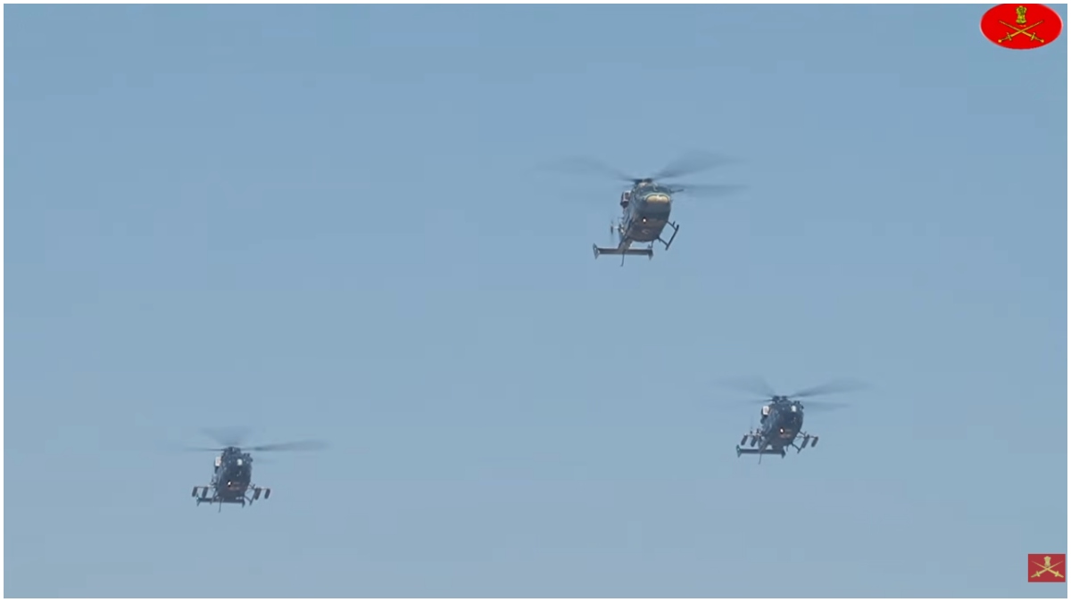 परेड ग्राउंड के ऊपर से Apache AH-64E अटैक हेलीकॉप्टर्स ने उड़ान भरी. उनके साथ स्वदेशी लाइट कॉम्बैट हेलीकॉप्टर 'प्रचंड' भी तालमेल बिठाते दिखे. आसमान में सेना की इस जुगलबंदी ने दर्शकों का दिल जीत लिया.