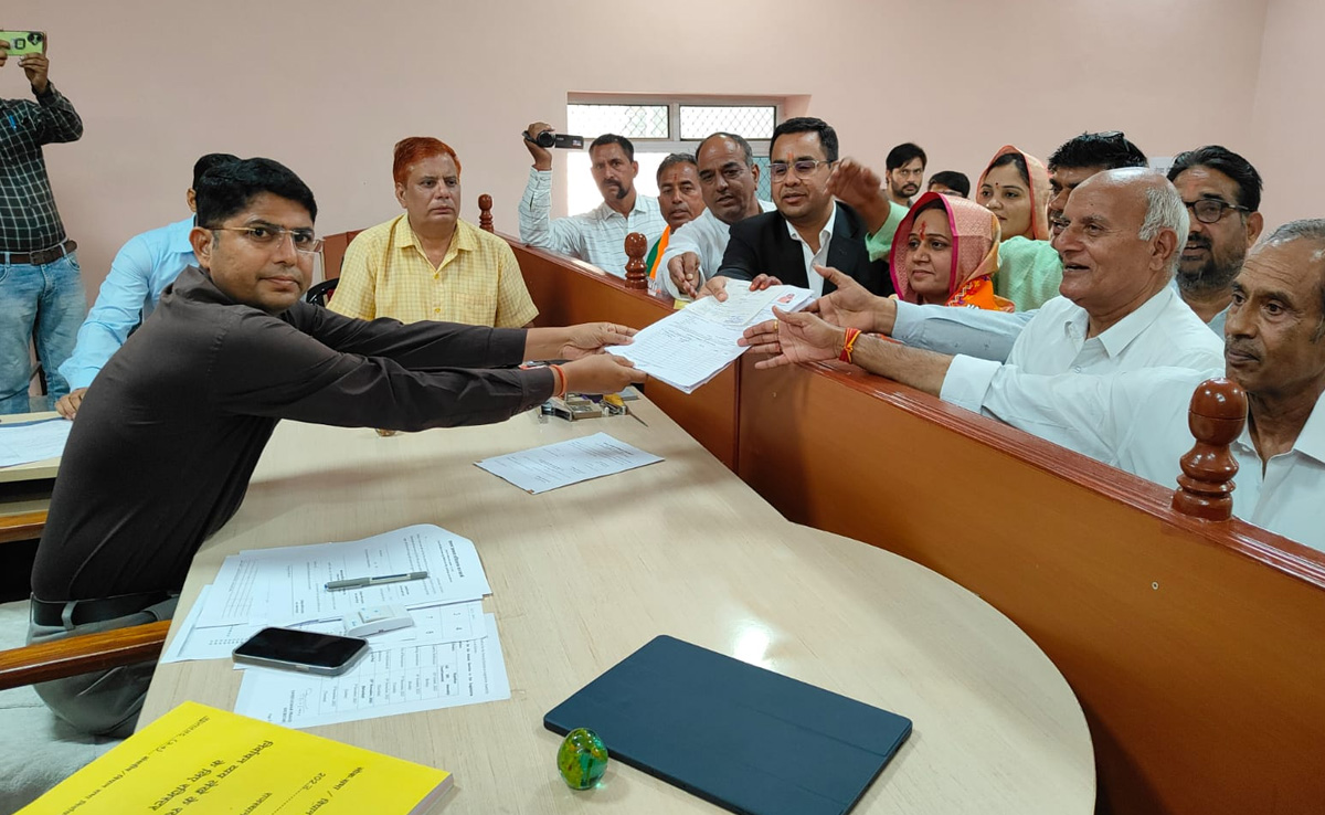 अपने परिजनों और समर्थकों के साथ नामांकन पत्र दाखिल करती भाजपा की उम्मीदवार संतोष मेघवाल