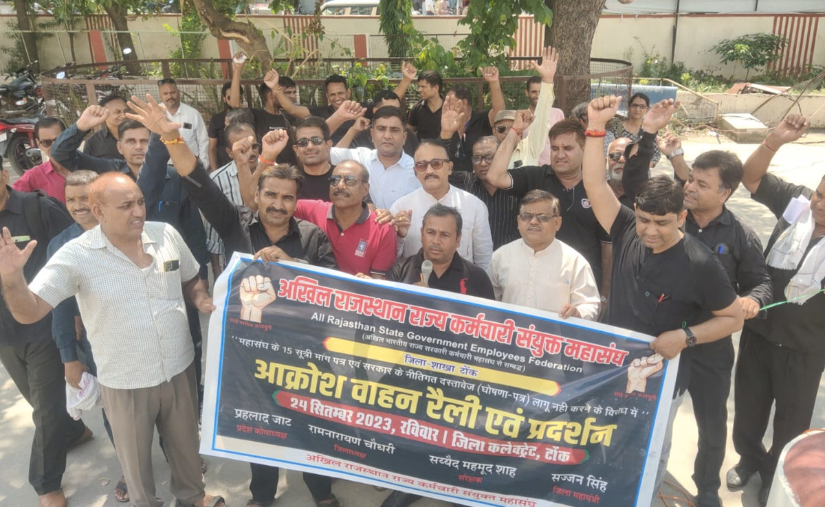 राजस्थान में लंबे समय से अपनी 15 सूत्री मांगों को लेकर राज्य सरकार से उम्मीद लगाए बैठे राजस्थान सयुक्त कर्मचारी संगठन ने अब उम्मीदें पूरी होते न देख सड़क पर उतरकर सरकार के खिलाफ विरोध का बिगुल बजा दिया है. रविवार को विरोध के प्रतीक काले कपड़ों में राजस्थान भर के जिला मुख्यालयों पर अपनी मांगों के समर्थन में रैलियां निकाली. ऐसी ही एक रैली टोंक में मुख्य बाजार होते हुए आज जिला कलेक्ट्रेट पहुंची, जिसमें सरकार से न्याय की मांग की गई.
