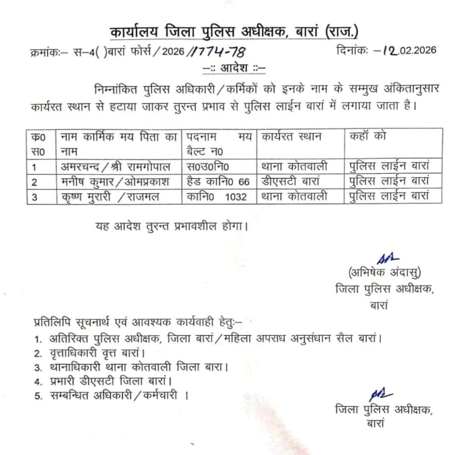 बारां में 3 पुलिसकर्मी लाइन हाजिर कर दिए गए. पुलिस एसपी अभिषेक अंदासु ने कोतवाली थाने के एएसआई अमरचंद, कांस्टेबल कृष्ण मुरारी और डीएसटी टीम के हेड कांस्टेबल मनीष कुमार को लाइन हाजिर कर दिया. फिलहाल कारण स्पष्ट नहीं है. हालांकि, इसे 9 फरवरी को बंद के दौरान गौ सेवकों पर लाठीचार्ज और पुलिस हिरासत में उनकी मारपीट के मामले से जोड़ा जा रहा है.