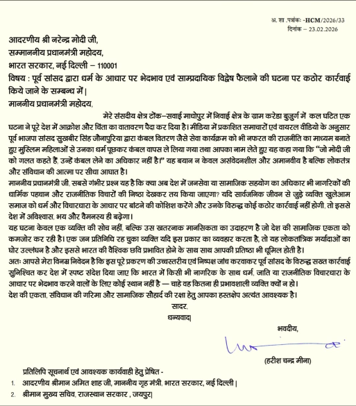 सुखबीर सिंह जौनपुरिया के मुस्लिम महिलाओं से भेदभाव वाले वीडियो वायरल होने पर सवाई माधोपुर के सांसद हरीश मीणा प्रधानमंत्री नरेंद्र मोदी को पत्र लिखकर कार्रवाई की मांग की है. मीणा ने कहा कि सुखबीर सिंह जौनपुरिया द्वारा कंबल वितरण जैसे सेवा कार्यक्रम को भी साम्प्रदायिक भेदभाव का माध्यम बनाते हुए मुस्लिम महिलाओं से उनका धर्म पूछकर कंबल वापस ले लिया गया तथा राजनीतिक टिप्पणी की गई. मीना ने इस कृत्य को न केवल अमानवीय और असंवेदनशील बताया, बल्कि संविधान की मूल भावना और लोकतांत्रिक मर्यादाओं पर सीधा आघात करार दिया है. ऐसे में सांसद ने मामले की उच्चस्तरीय एवं निष्पक्ष जांच कराने तथा पूर्व सांसद के विरुद्ध कठोर कार्रवाई सुनिश्चित करने की मांग की है.