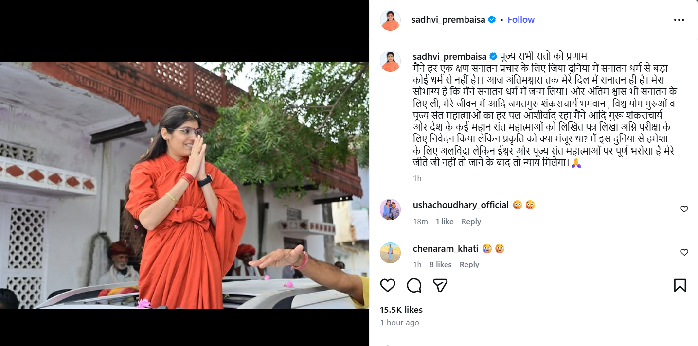 चर्चाओं में रही साध्वी प्रेम बाईसा का निधन हो गया है. कथित तौर पर साध्वी प्रेम बाईसा का निधन बुधवार (28 जनवरी) की शाम को हुई. वहीं मौत का कारण पता नहीं चल पाया है. पुलिस मामले की जांच में जुट गई है और प्रेम बाईसा का शव मोर्चरी में पोस्टमार्टम के लिए रखवाया गया है. वहीं साध्वी प्रेम बाईसा के इंस्टाग्राम हेंडल से एक पोस्ट भी की गई है. लेकिन यह पोस्ट कथित तौर पर मृत्यु के बाद की गई है. जिसमें न्याय की मांग की गई है.