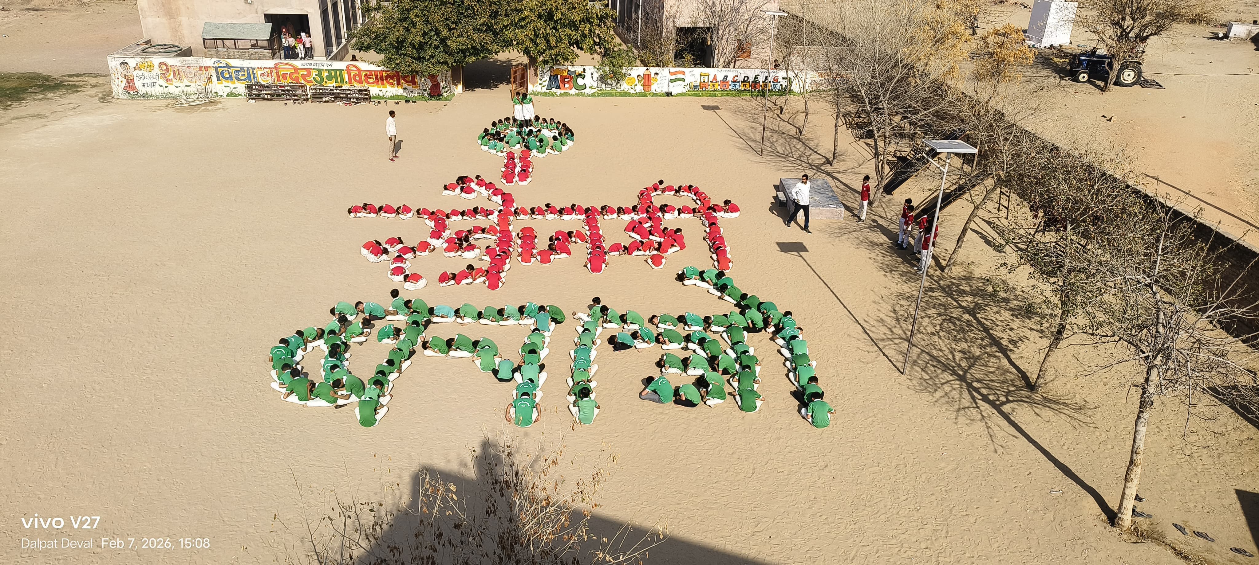 बीकानेर में विद्यार्थियों ने मानव आकृति बनाकर खेजड़ी बचाने का संदेश दिया. बज्जू के शारदा विद्या मंदिर स्कूल के विद्यार्थियों ने अद्भुत पहल की. हरे व लाल रंग की स्कूल ड्रेस में विद्यार्थियों ने मानव आकृति बनाई. बता दें कि बीकानेर बिश्नोई धर्मशाला के सामने 7 दिनों से महापड़ाव चल रहा है.
