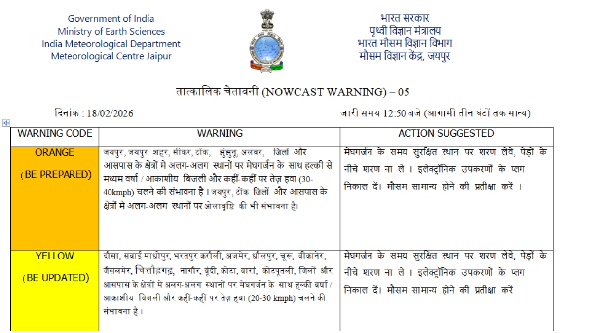 Rajasthan Weather 18 February Higlights: भारत मौसम विज्ञान विभाग (IMD) जयपुर ने आज सुबह 09:40 बजे चेतावनी जारी करते हुए राजस्थान के जयपुर और अजमेर सहित 26 से अधिक जिलों में अगले तीन घंटों तक मेघगर्जन और बारिश का अलर्ट दिया है. जयपुर, अजमेर और आसपास के क्षेत्रों के लिए 'ऑरेंज अलर्ट' जारी किया गया है, जहां हल्की से मध्यम वर्षा के साथ ओलावृष्टि (Hailstorm) की प्रबल संभावना है. इसके अलावा, दौसा, सवाई माधोपुर, करौली और अलवर जैसे जिलों में 40 किमी/घंटा की रफ्तार से तेज हवाएं और आकाशीय बिजली गिरने की चेतावनी दी गई है, जबकि सीकर, टोंक और उदयपुर सहित 17 अन्य जिलों को 'येलो अलर्ट' पर रखा गया है. इस लाइव ब्लॉग में हम आपको बताएंगे कि राजस्थान में कहां-कहां बारिश हो रही है और हर थोड़ी देर में वहां की ताजा स्थिति से अपडेट कराएंगे.