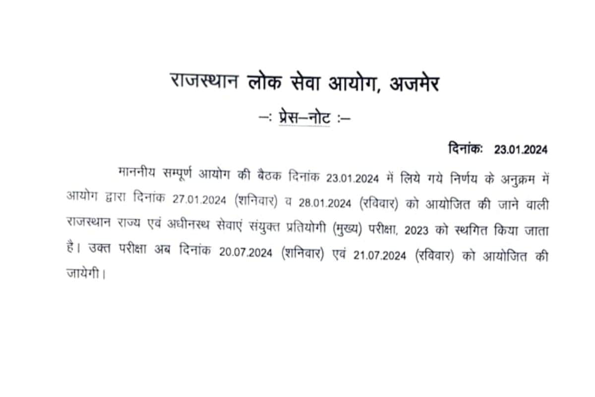 आयोग ने चिट्ठी जारी कर कहा कि 27.01.2024 और 28.01.2024 को आयोजित की जाने वाली राजस्थान राज्य एवं अधीनस्थ सेवाएं संयुक्त प्रतियोगी (मुख्य) परीक्षा, 2023 को स्थगित किया जाता है. उक्त परीक्षा अब दिनांक 20.07.2024 और 21.07.2024 को आयोजित की जाएगी.