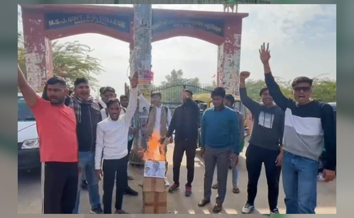 भरतपुर जिले में 'जिला जाट महासभा' के कार्यकर्ताओ द्वारा एम.एस.जे कॉलेज के मुख्य द्वार पर सांसद का पुतला फूंका.