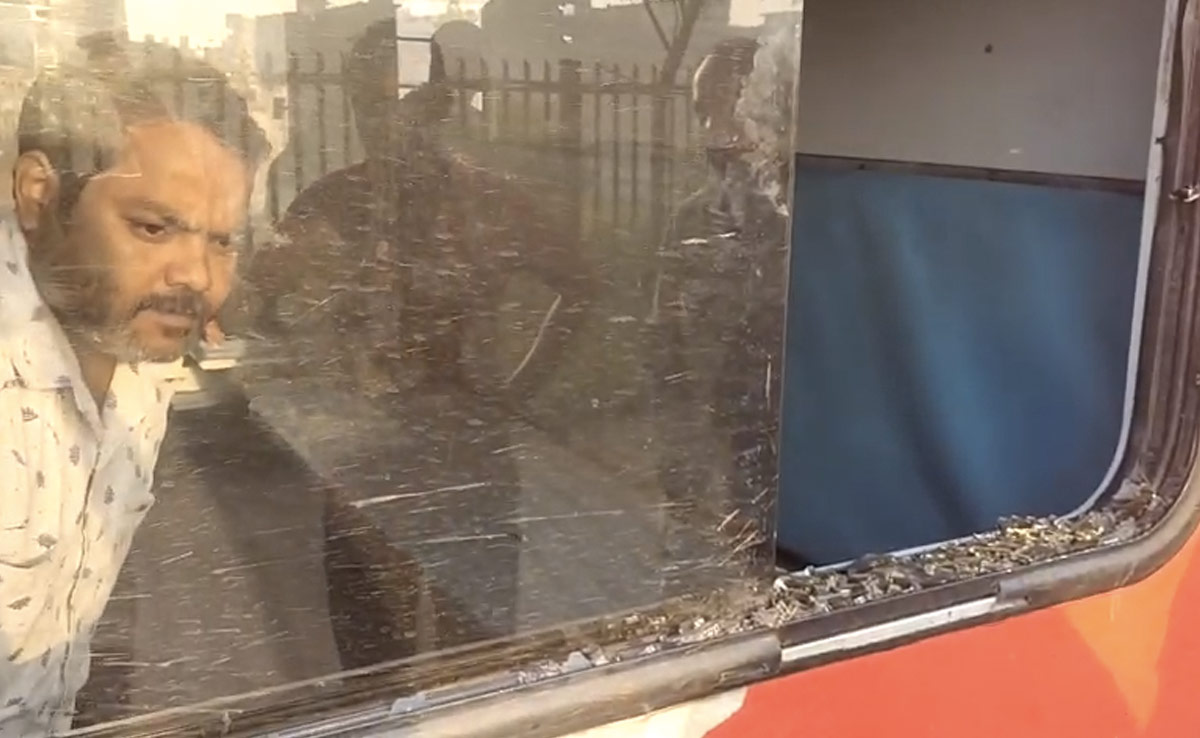 ये वारदात डूंगरपुर के बलवाड़ा फाटक के नजदीक की बताई जा रही है. लोगों का कहना है कि अज्ञात बदमाशों ने अचानक सुबह करीब 5:30 बजे जयपुर से असारवा जा रही ट्रेन पर पथराव करना शुरू कर दिया, जिसमें ट्रेन की एक बोगी का शीशा टूट गया. गनीमत रही कि शीशा टूटने से किसी भी पैसेंजर को कोई चोट नहीं आई. इस दौरान की एक तस्वीर भी सामने आई है, जिसमें कांच के टुकड़े ट्रेन के अंदर बिखरे नजर आ रहे हैं.