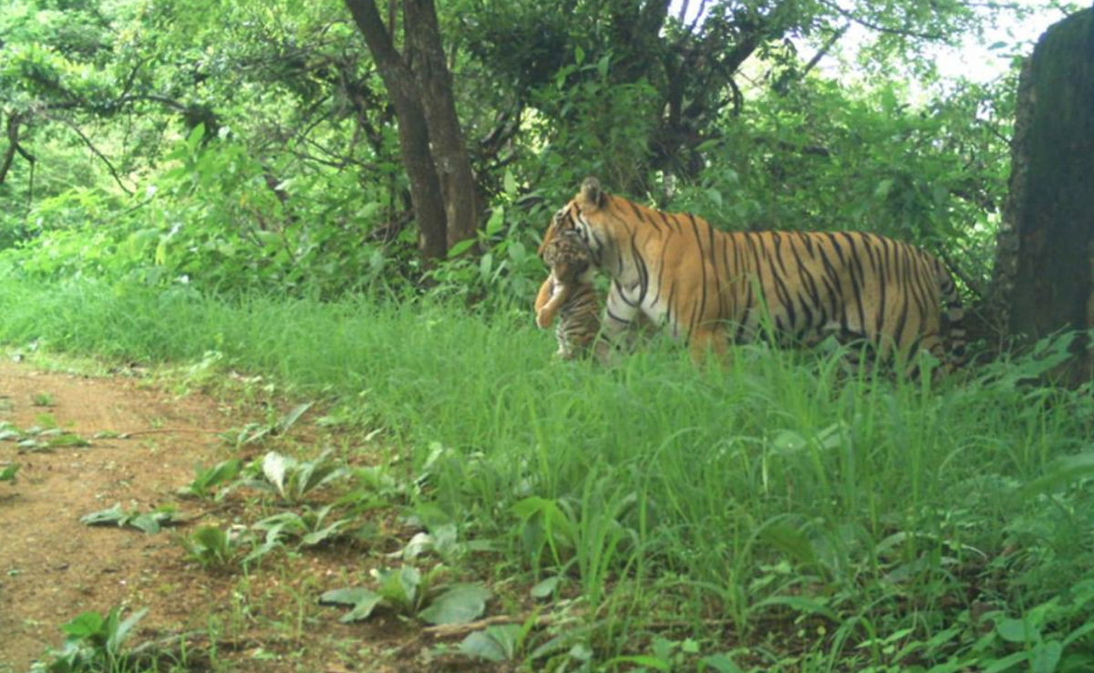 राजस्थान के सवाई माधोपुर स्थित रणथंभौर नेशनल पार्क से एक बार फिर खुशखबरी सामने आई है. रणथंभौर की बाघिन टी 124 ने तीन शावकों को जन्म दिया है. बाघिन टी 124 की तस्वीर तीन नन्हे शावकों के साथ वन विभाग के फोटो ट्रैप कैमरे में कैद हुई है. जिसमें बाघिन रणथंभौर के राजबाग महल के पास अपने नवजात शावकों को मुंह में दबाकर एक जगह से दूसरी जगह शिफ्ट होती हुई नजर आई है.